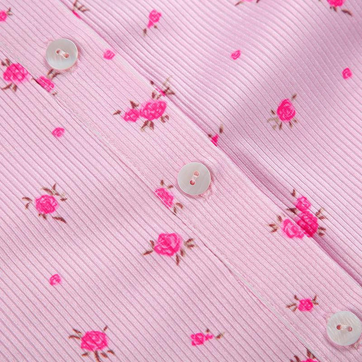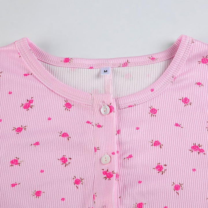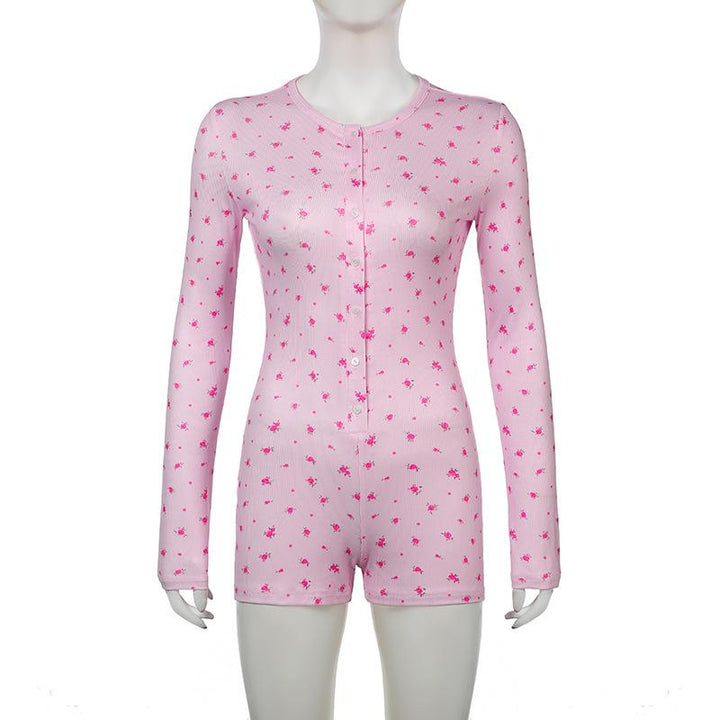 Long sleeve crewneck button flower print romper